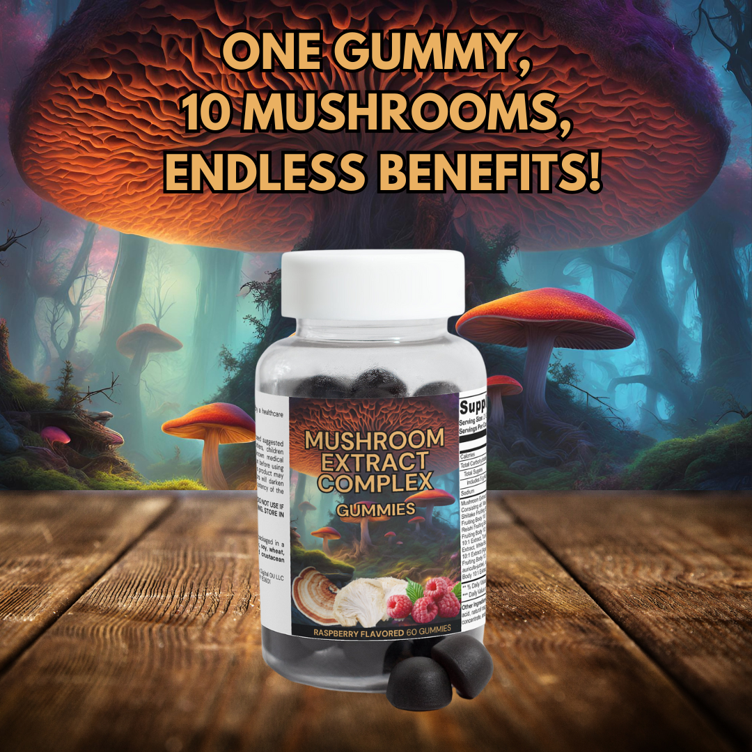 Our Mushroom Extract Complex Gummies combine the most sought-after mushrooms in the world: Maitake, Shiitake, Lion's Mane, Reishi, Cordyceps, Chaga, Turkey Tail, White Button Mushroom, Black Fungus, and Royal Sun Mushrooms.